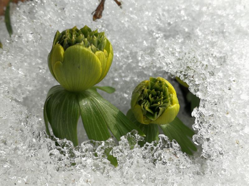 Nachdem der eisige Boden in der oberen Schicht aufgetaut ist sieht man die ersten Sämlinge von Eranthis pinnatifida. Leider ist eine Blüte abgefallen.