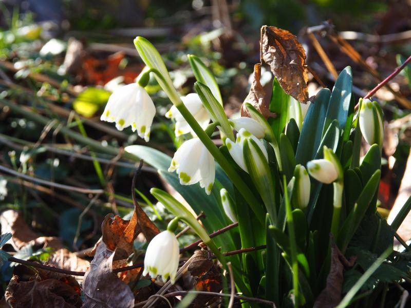 Die Leucojum sehen hier passabel aus, bei einigen mit wie festsitzenden, bodennahen Blüten.
