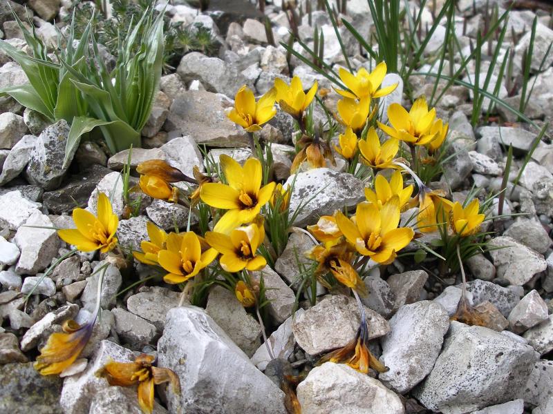 Crocus korolkowii ist ein ganz erstaunlicher Krokus. Obwohl er aus heißen und trockenen Lagen stammt, steckt er hier jede Kälte und Nässe weg und blüht reichlich. Der strengen Kahlfrost der letzten Tage hat ihm offensichtlich nichts ausgemacht.