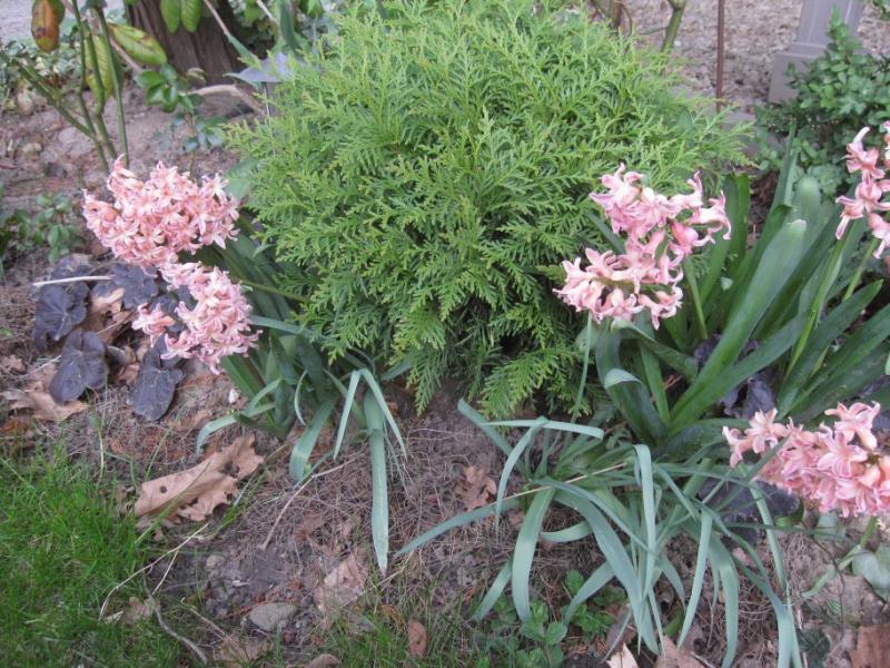 Hier blühen derzeit wieder die ehemaligen Topf-Hyacinthen. Im Beet: