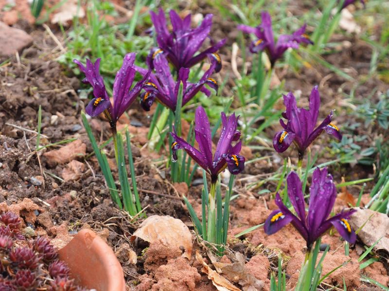 Weder 'George' noch eine der anderen blauen und lila-farbenen Sorten zeigt hier bislang Farbe. Nur eine I. dandfordiae hatte schon vor dem Frost eine Blüte weit geschoben.