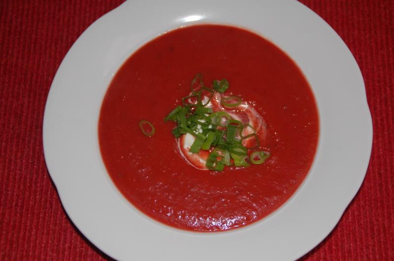rote Suppe, sehr pikant (rote Bete, Kartoffeln, Zwiebel, Petersilienwurzel, Porree, Lauchzwiebel, Möhre, scharfer Linsenaufstrich, Ingwer, Gemüsebrühe, Butter, Sahne)