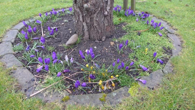Crocus tommasinianus 'Barr's Purple' im Vorgarten, vermehren sich genauso gut wie die Art.
