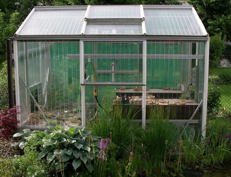 Mein Alpinenhaus ist nichts anderes als ein kleines handelsübliches Gewächshaus. Um das Raumklima zu verbessern, habe ich zusätzliche Fenster eingebaut und die Grundfläche liegt ca. 50 cm unter Gartenniveau. Ich stelle mal ein Bild ein. Da kannst Du auch ganz gut die Inneneinrichtung erkennen.