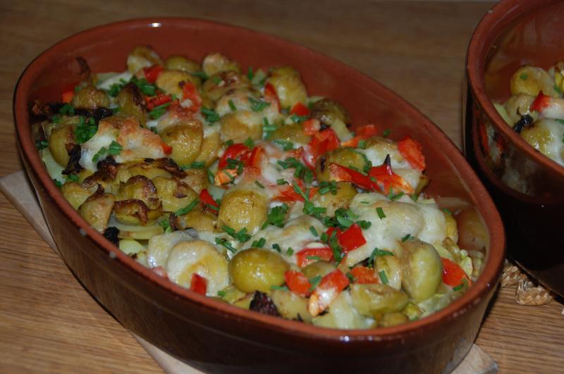 Rosenkohlgratin (Kartoffeln, Rosenkohl, Lauchzwiebel, getrocknete Tomaten, Paprika, Mozzarella, Ei, Sahne, Creme fraiche, Milch, S&P, Thymian, Schnittlauch)