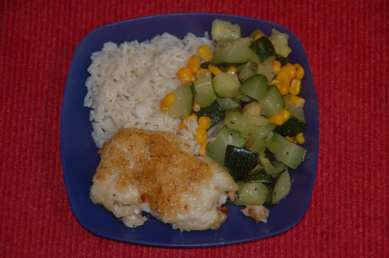 Kaffirlimettenreis, Zucchini und Mais, Seelachs 'Rosmarin-Zitrone'