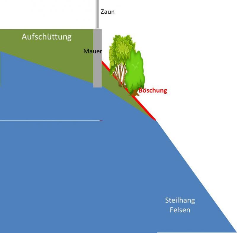 Da ich offenbar mit meiner Beschreibung ein wenig Verwirrung angerichtet habe, hab ich mich bemüht, eine kleine Grafik zum besseren Verständnis anzufertigen - ich hoffe, das klärt nun, was bisher unverständlich war. Ob die Neigung korrekt ist, kann ich nicht einschätzen. Die Mauer, die sichtbar bleibt, ist jedenfalls zumindet 1,5 m hoch und der Zaun darauf auch.