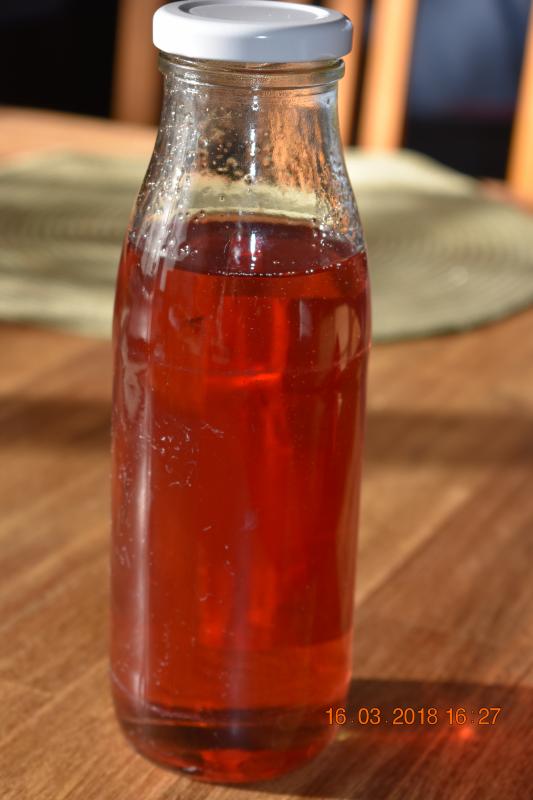 Das Ergebnis ist ein erdbeerroter Sirup mit angenehmen Geschmack und Duft. Passt auch zum Erbeerkuchen.