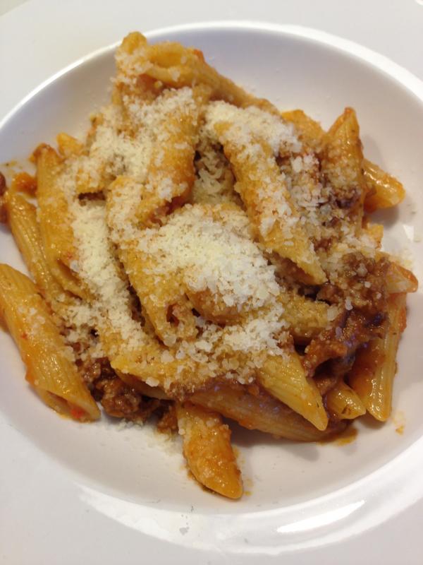 Wildfleisch-Hackbällchen in Tomatensoße mit den kleinen griech. Nudeln und 3 Sorten Käse überbacken (was noch da war)