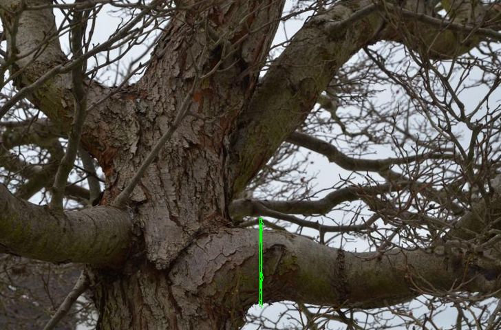 Ich habe diese Grenzflächen einmal gelb gepunktet für drei Äste eingezeichnet, soweit ich die auf dem Foto erkennen kann. In dem Fall des rechten Asts ist diese jedoch in der Seitenansicht eher ein Dreieck, deswegen sollte dort nicht an der "Grenze" geschnitten werden, sondern entlang der imaginären 3. Seite des Dreiecks.