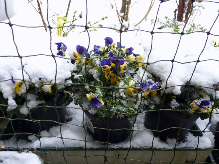 Hier hat es bis zum Nachmittag leicht geschneit, bei ziemlich ungemütlichem Nordostwind. Jetzt hat beides aufgehört, so dass man mal nach draußen zum Schneeschippen gehen konnte. Die etwas empfindlicheren Pflanzen im Vorgarten haben eine Schneeabdeckung bekommen, und ich hoffe, dass die ganzen Osterglockenstängel nicht alle abknicken. Die Vögel scheint der Schnee bei ihrer Balz nicht sonderlich zu stören, zur Stärkung habe ich noch ein paar von meinen getrockneten Sonnenblumenköpfen auf die Terrasse gestellt.