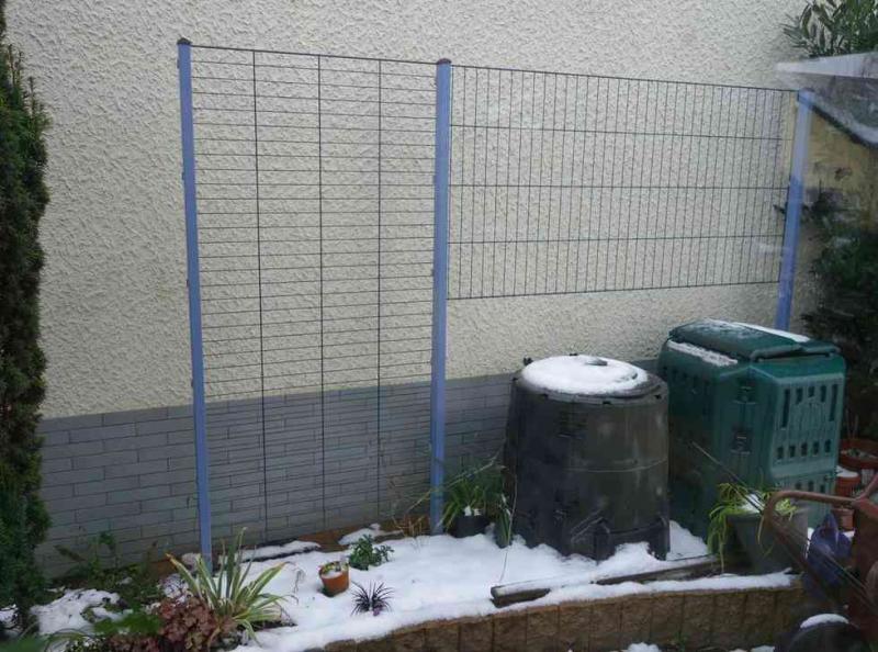Die Pfosten sind verzinkt und angemalt (passend zu unseren blauen Fenstern... ;)), dazwischen sitzen Doppelstabmatten. Kann man auch anders anordnen, und die Pfosten gab es auch länger, glaube ich zumindest.