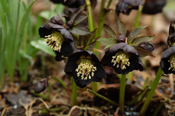 Die gelben Helleborus sehen hier am schlimmsten aus, die dunkle dagegen hat den Frost gut überstanden