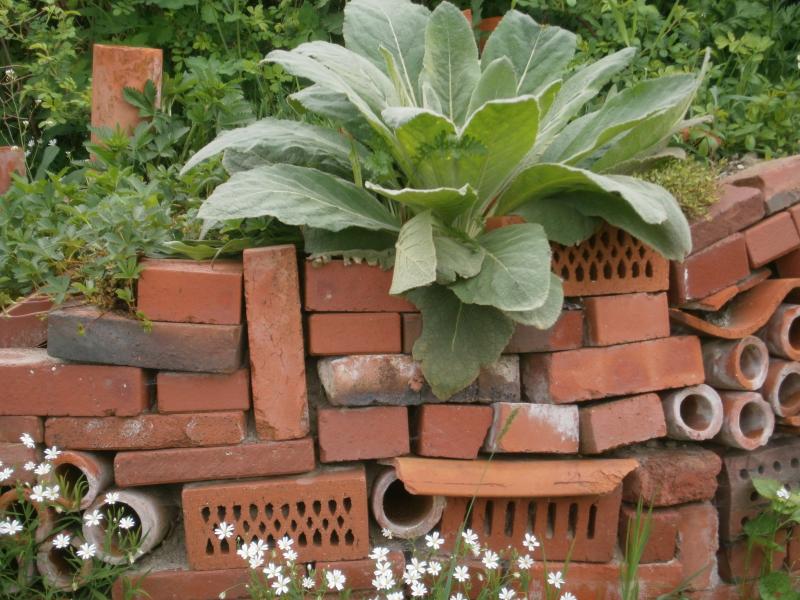 Über die Jahre haben sich eine Menge verschiedene Ziegelsteine, Beeteinfassungen, Pflastersteine etc. angesammelt, die jeweils übrig blieben. Nun kam mir die Idee, vor dem hässlichen Komposthaufen eine kleine Mauer mit diesen Steinen hochzuziehen.