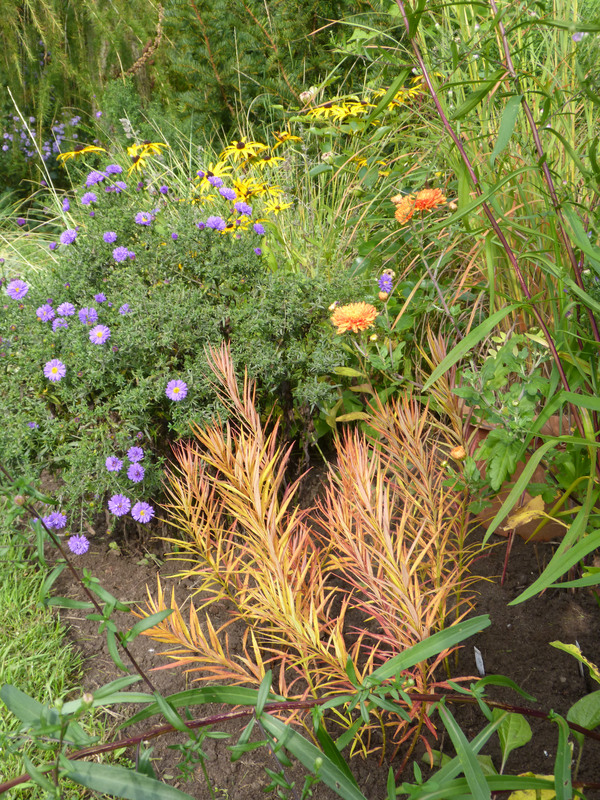 Amsonia hubrichthii in Herbstfärbung - frisch gepflanzt mit Chrysanthemum 'Dixter Orange' als Nachbar.