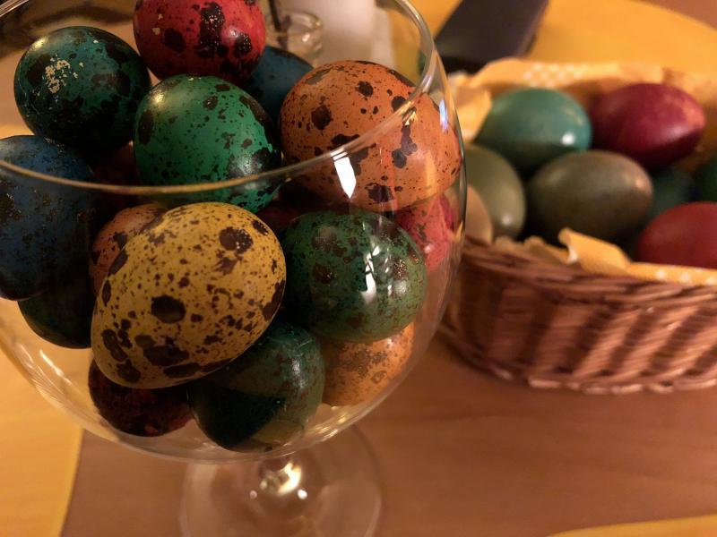Lustig, die unüblich bemalten Eier. Wachteleier habe ich auch wieder ein paar gefärbt, die gefallen mir besser als Hühnereier.