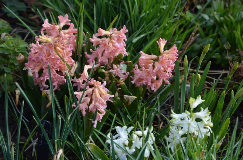Hyazinthe 'Gipsy Queen' fand ich farblich zunächst nicht so prickelnd, inzwischen gefällt sie mir recht gut, vor allem in Nachbarschaft von Euphorbia 'Ascot Rainbow'. Der Abstand ist für Fotos aber noch zu groß...