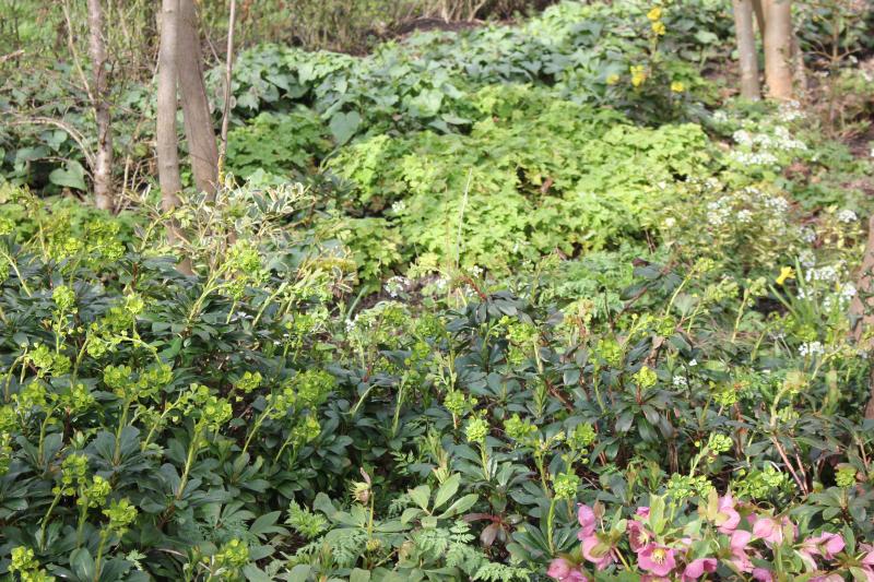 Dunkelsattgrün ist die Euphorbia amygdaloides robbiae, so langsam mit ihren helleren Blüten:
