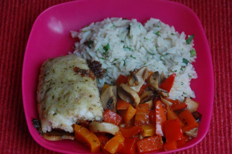 Heute gab es Petersilienreis mit Kap-Seehecht 'Rosmarin-Olive' und Champis mit Paprika.
