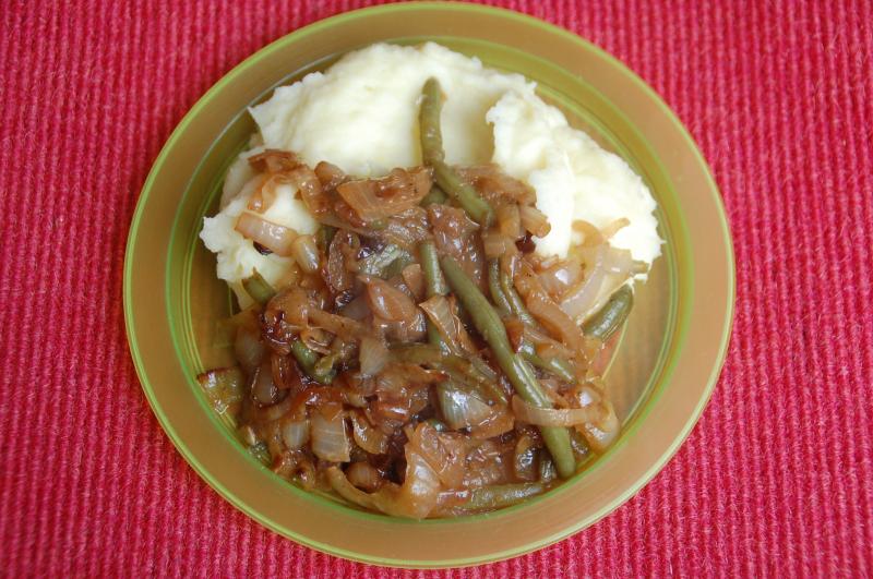 Heute gab es Gemüse, dass auch großen Kindern schmeckt (letzter Ferientag - der große Sohn war unfreiwillig fürs Mittag zuständig): gebratene Zwiebeln mit Bohnen, dazu Kartoffelbrei.