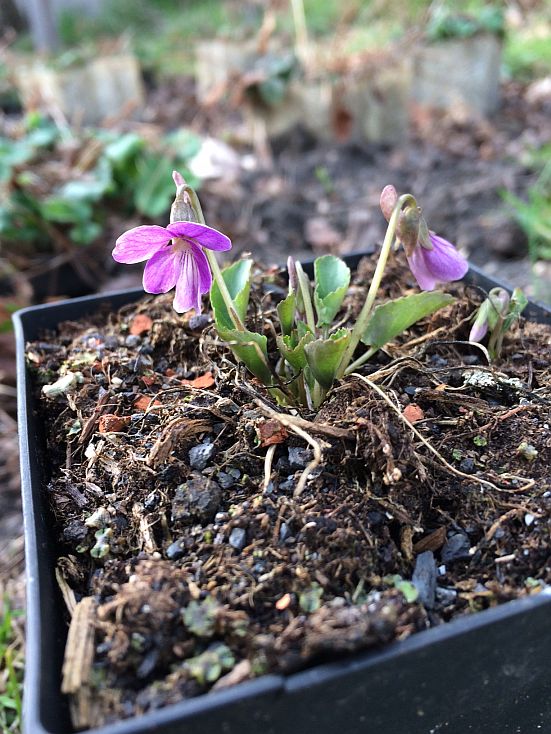 Drei Wald- und/oder Hainveilchen in "normal", rotlaubig (fälschlich "Viola labradorica") Und rosablühend (fälschlich "Viola rupestris `Rosea´").
