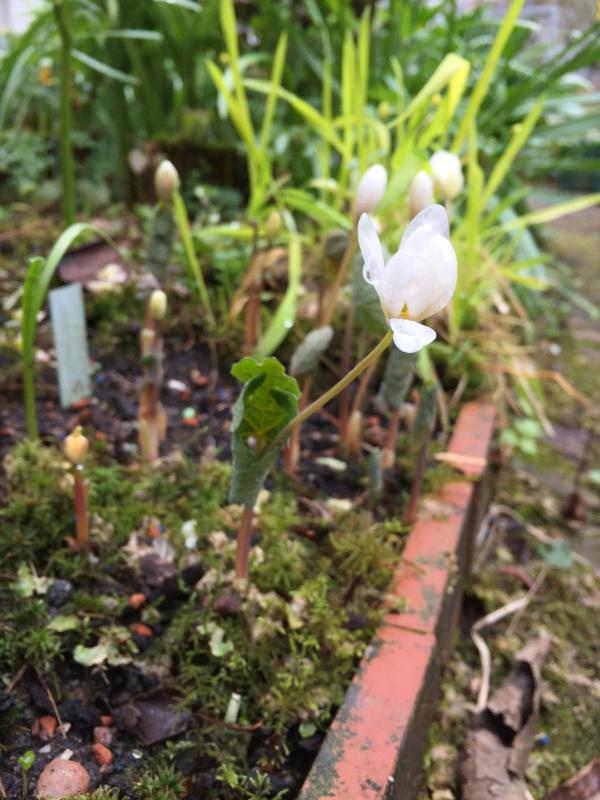 Hier schieben sich auch Knubbel aus der Erde, die ich mit ziemlicher Sicherheit als Sanguinaria ansprechen möchte. Ich wähnte sie schon verloren, hatte aber woanders gesucht (Randstreifenerweiterung). Beinahe hätte ich die merkwürdige Lücke bepflanzt. :-X