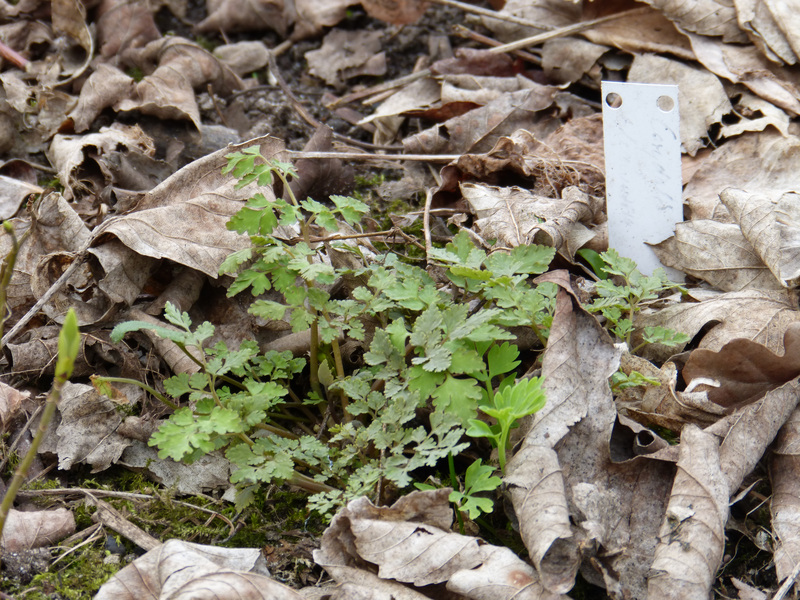 Corydalis sheareri (sehr wahrscheinlich), die Wildsammlung von Wühlmaus, hat zwar die meisten Blätter im Frost verloren, die Blütenknospen und die Knospen der Achselbrut haben aber überlebt.