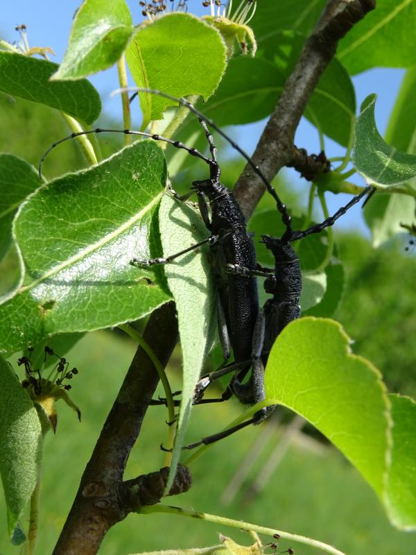 Diesen Bockkäfer sehe ich schon seit einigen Jahren immer mal wieder auf meinen Birnenbüschen sitzen, diesmal ist er aber zu zweit. Muss ich Angst haben, wenns mit der Befruchtung geklappt hat?