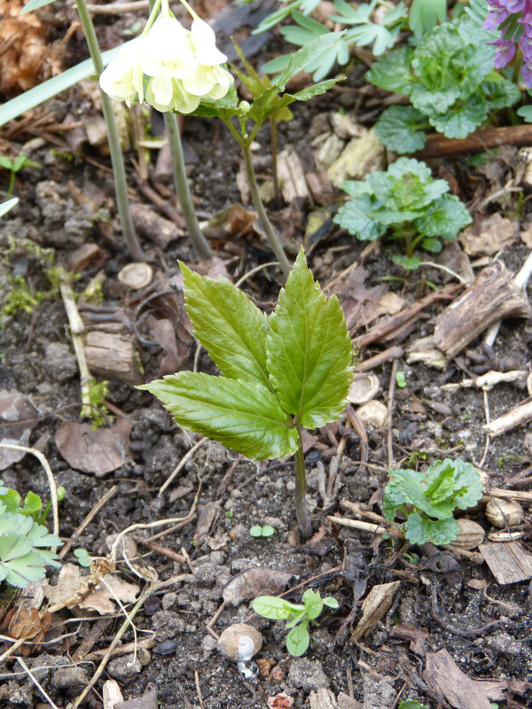 Hier taucht Cardamine enneaphyllos gerade erst auf, weil sie in einer völlig sonnenfreien, kühl bleibenden Ecke steht.