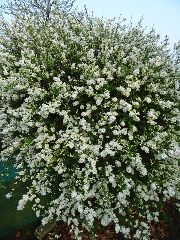 Exochorda macrantha 'The Bride' (Prunkspiere, Perlstrauch), eine weiße Wolke von etwa 2,50 Meter hoch.