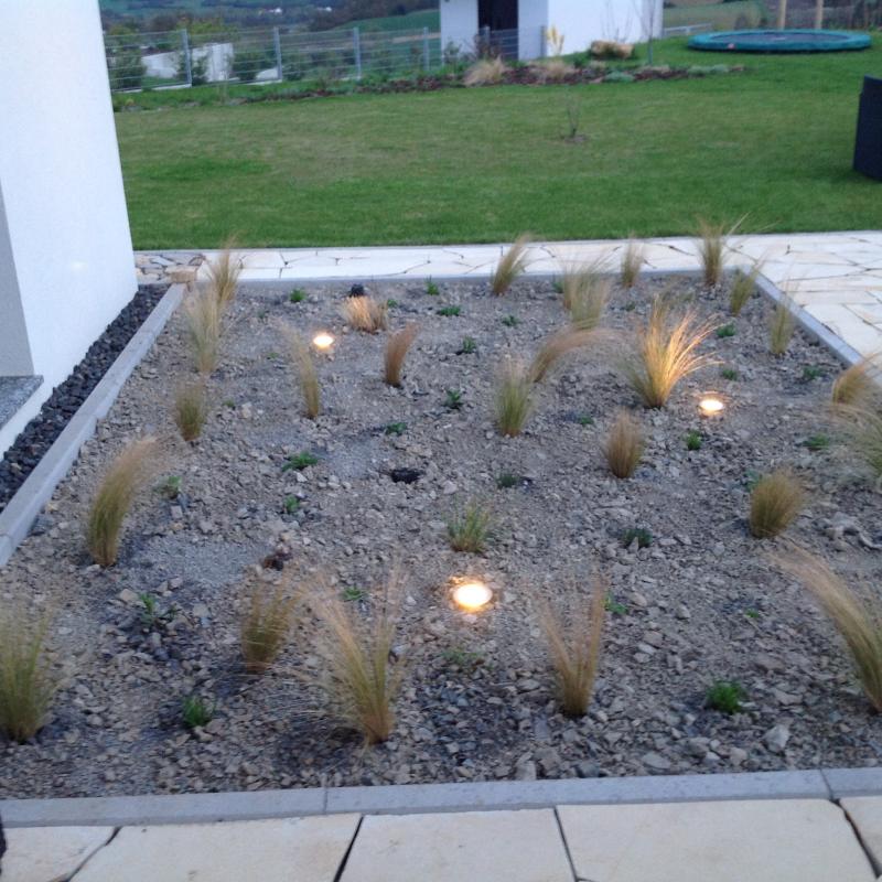 An zwei Strahlern steht jeweils ein Stipa gigantea, was dann - so ist der Plan- mit seinen langen Rispen illuminiert wird. An dem dritten Strahler wird jetzt schon ein Stipa tenuissimA angestrahlt und sieht wunderbar aus mit seinem sanften Schwingen im Wind. Die Lichtkegel reichen aus, um an der Hauswand einen Schattenwurf der Pflanzen zu realisieren. Für mich sollte gerade nicht das Haus im Mittelpunkt der Beleuchtung stehen, mich stört das, zumal unsere Kinder ihre Zimmer da haben und auch nicht "herausgeleuchtet" werden sollen.