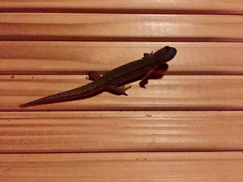 Unsere sind auch da. Nachdem ich einen toten Teichmolch und den größten Gelbrandkäfer, den ich je gesehen habe, vorige Woche rausgefischt habe, konnte ich heute zwei Molche beobachten, einer nett gepunktet, einer mehr einfarbig und auch etwas größer.