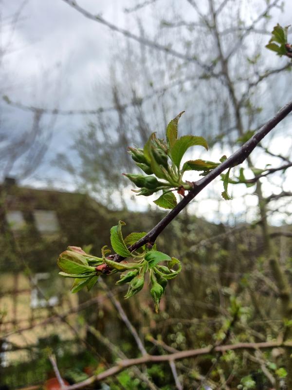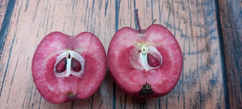 Ja, aus rotfleischigen Äpfeln gezogen. Die Blütenfarbe wird zeigen welche Farbe das Fruchtfleisch haben wird. Wahrscheinlich aber nicht rot, da das Laub der Pflanze keine Rottöne zeigt. Dafür hat er die "perfekte" Aststellung. Gerade zur Seite weg.