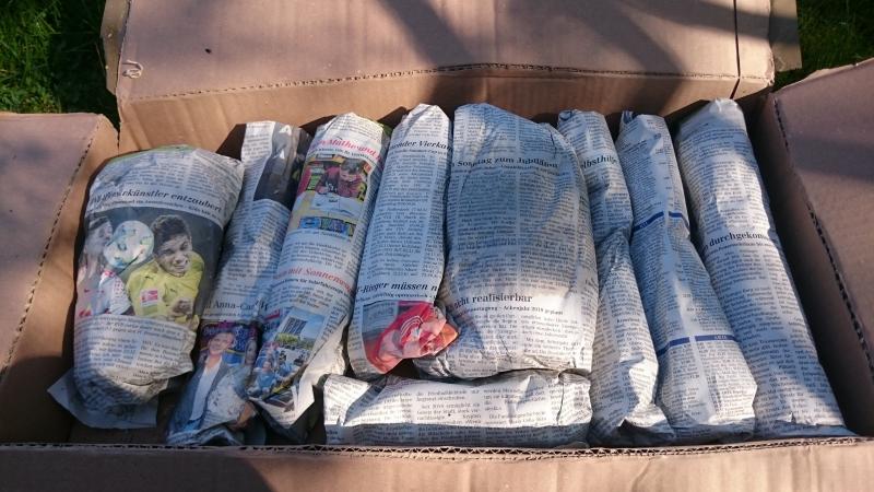 Genial verpackt: Unten in der Kiste eine Palette, in der alle Töpfe fest standen. In jedem Topf ein Holzstab, oben mit Pappe abgestützt. Keine lose Erde, nichts, alles heil! 8)