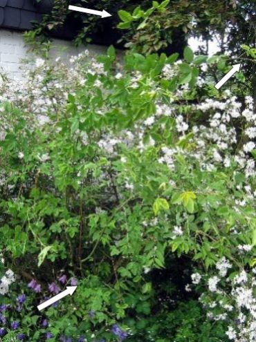 Das Foto wollte ich natürlich machen. Also ging ich mit Apparat hinaus.Ehe ich aber fotografieren konnte, mußte ich erstmal zur Schere greifen.Hier war er schon weitgehend freigeschnitten, trotzdem aber auf dem Foto so grün in grün iund auch bei der groben Auflösung schlecht zu sehen. Daher habe ich Pfeile gesetzt, wo der Stamm sichtbar wird und wo die Enden der beiden Hauptäste sind. Es hat sich nämlich gezeigt, dass das Jungbäumchen sich schon in drei Äste verzweigt hatte. Leider kommt es aber nur mit einem Stamm aus dem Boden.callis kannst du mal ein foto von der beschriebenen situation einstellen?... vielleicht solltest du ihm nur ein wenig licht verschaffen, damit er möglichst schnell den "deutzienschirm" hinter sich/ unter sich lassen kann ....