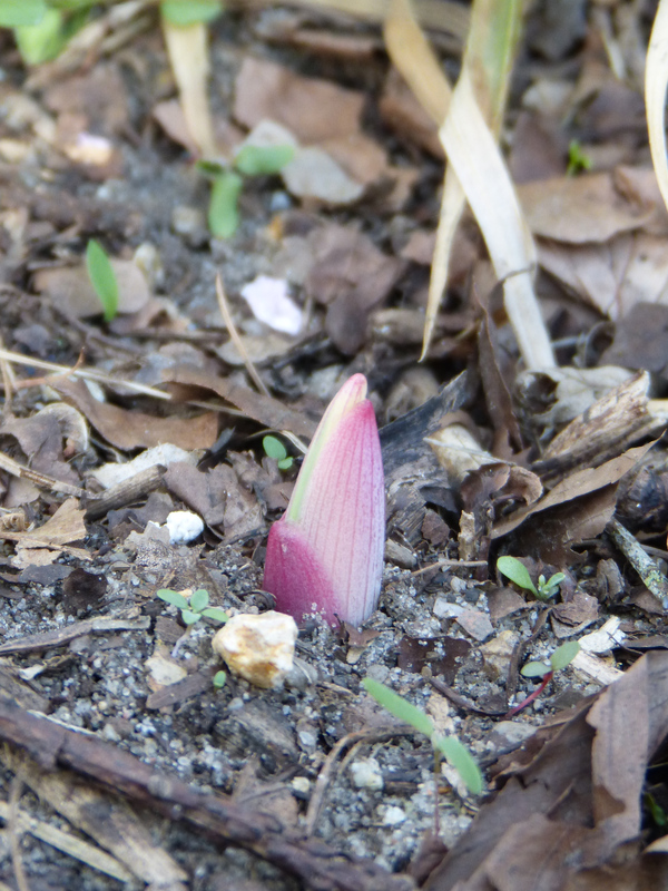 Wenn wir schon bei Austrieben sind - Polygonatum odoratum 'Kayaba Nishiki' guckt farbig aus der Erde.