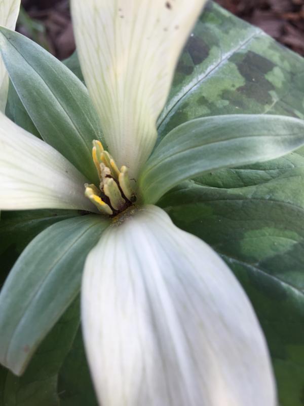 toll! ich halte es für einen hybriden aus chloropetalum x albidum, die auch in der natur vorkommen ("J. D. Freeman (1975) considered that Trillium chloropetalum differs from T. albidum in having introrse (not latrorse) anther sacs, and that the purple pigments present on anther and ovary tissue here are absent in T. albidum. In some places, hybridization between the two certainly has occurred, and a complete range of intergrades exists.")