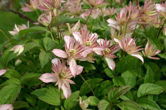 Hier ein Bild von einer Clematis montana Majorie.Blüht bei mir in der Nachbarschaft.GrußFuliro