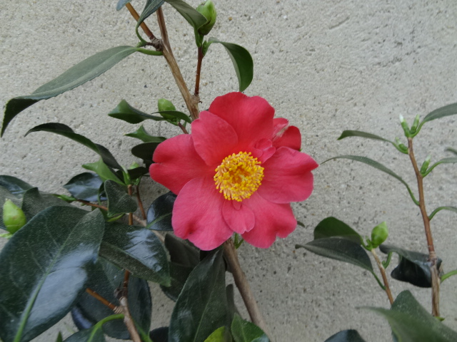 Hier blüht nun die im Herbst knospig geschenkt bekommene Kamelie.