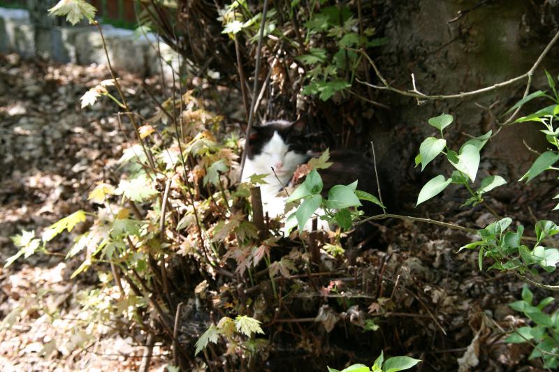 Heute habe ich schon über Schnucki gelacht. Wir haben einen großen Ahorn im Garten, der ist vor ein paar Jahren mal ganz stark zurückgeschnitten worden. Da entstand am Fuße so eine große Tasche. Da sah ich heute Schnucki ganz genüsslich zusammengerollt liegen. Das sah so süß aus. Hatte gerade die Kamera in der Hand. Das Bild ist nicht so scharf geworden, das Licht war auch nicht gut.