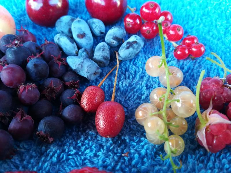 (Links davon sind Felsenbirnen, rechts weiße Ribiseln und Himbeeren, oberhalb Kamtschatkabeeren, rote Ribiseln und Kirschen)
