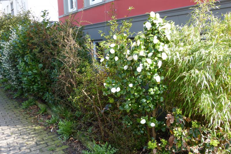 Hier die Kamelie als Teil der Vorgartenhecke. Links im Bild ebenfalls (trotz Nordausrichtung) blühend Osmathus burkwoodii