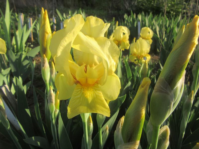 Manchmal bekommt man dann doch ein Fragezeichen weg, eine dieser namenlosen gelben IBs blüht recht zuverlässig im Herbst nach, was ein Hinweis auf `Sangreal´ (Jacob Sass 1935) ist. Die benannte Vergleichspflanze (ganz links) sagt das nun auch, Sorte identifiziert. Klasse! Auch wenn es keine verschollene Schönheit, sondern eine noch relativ häufig kultivierte Sorte ist. Momentan wirkt sie etwas blass, sie kann aber auch dunkler.
