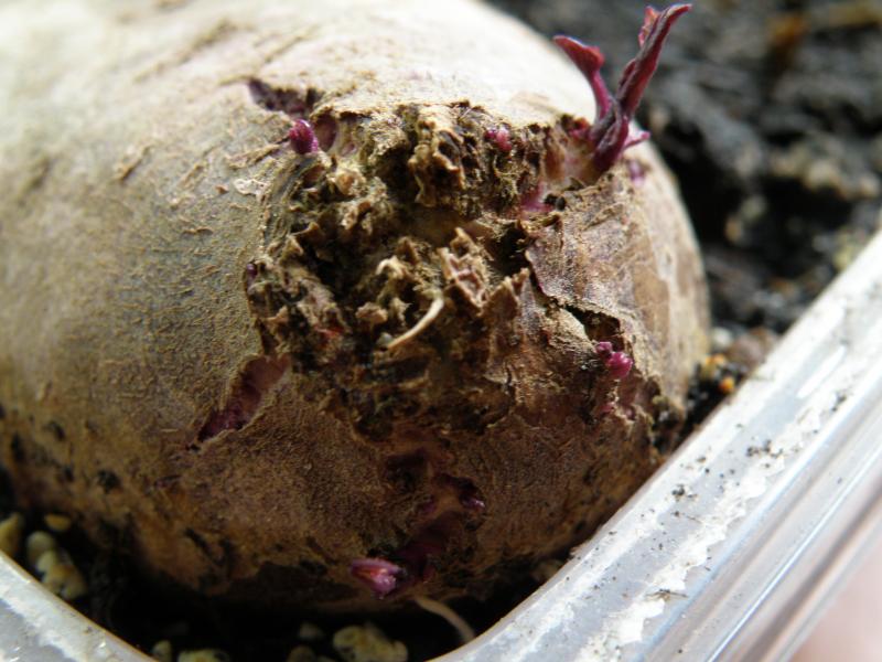 Im Gegensatz dazu tut sich bei der halbierten Knolle mit der Schnittstelle gar nichts. Ich hatte die Schnittstelle für 2 Tage verkorken lassen und dann die obere Hälfte der Knolle getopft. Heute habe ich nachgesehen
