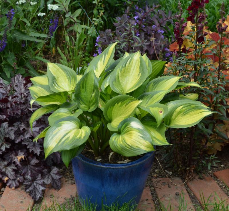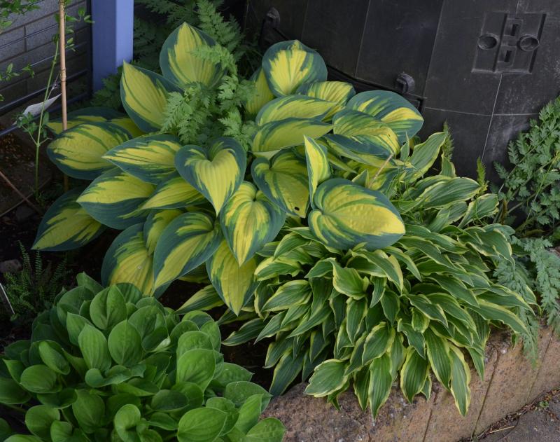 Fünf Hostas an der Einfahrt sind ein bisschen meine Ordnungshüter im wildhaften Bereich.Drei davon; von links, Eisvogel Chiemsee, Touch of Class, American Halo