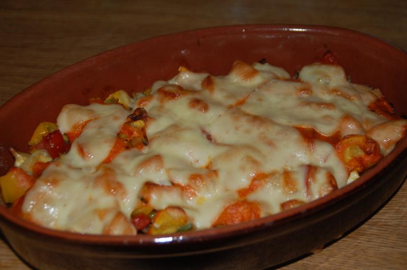 Getreidegratin (Roggen, Porree, Paprika, Pastinake, Tomate, Rest der gestrigen Nudelsoße vermischt mit süßer und saurer Sahne, Gouda)