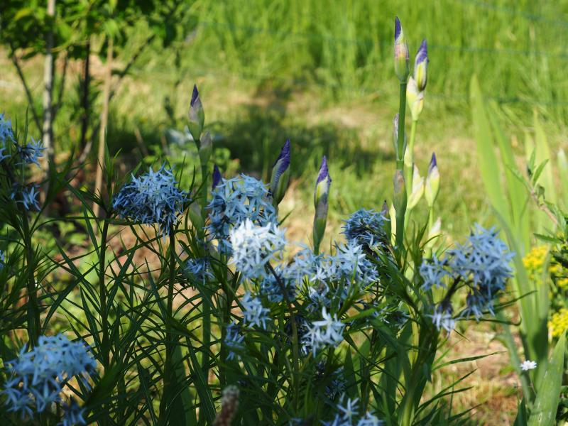 Amsonia Hubrichtii - der Bastard mit Amsonia tabernaemontana - und Knospen historischer Schwertlilien.