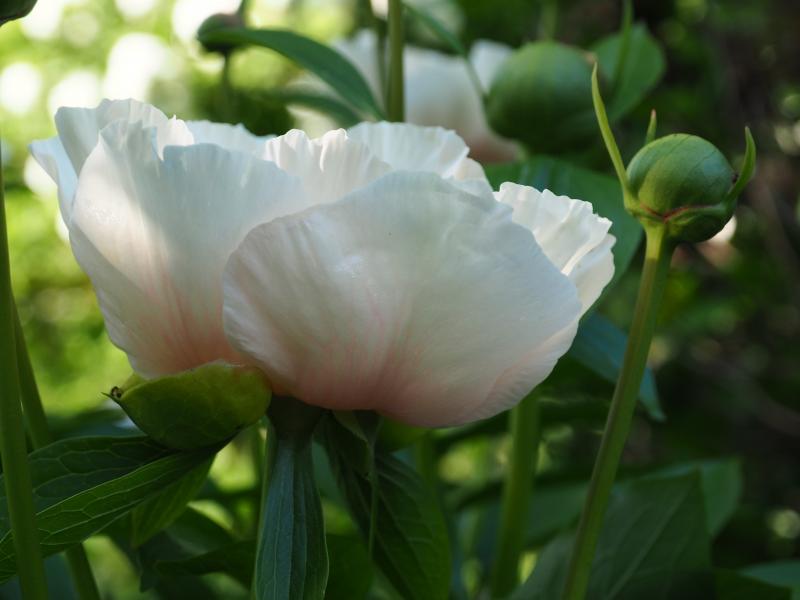 Paeonia officinalis 'Alba Plena' hat sich kräftig bestockt.