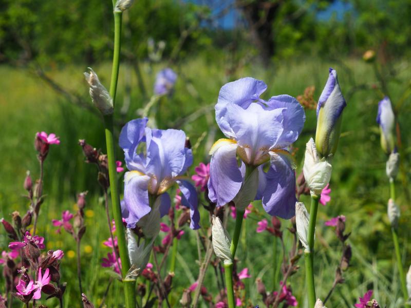 Iris pallida mit Roter Lichtnelke, Silene dioica.