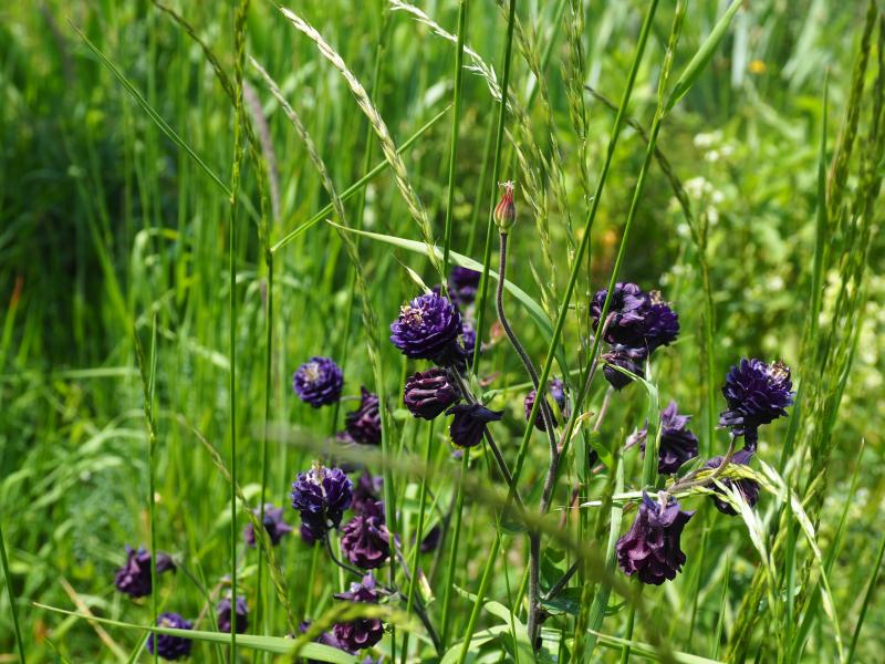 dunkel blau gefüllte Akeleien in der Wiese. Meist Glatthafer, Arrhenatherum elatius.